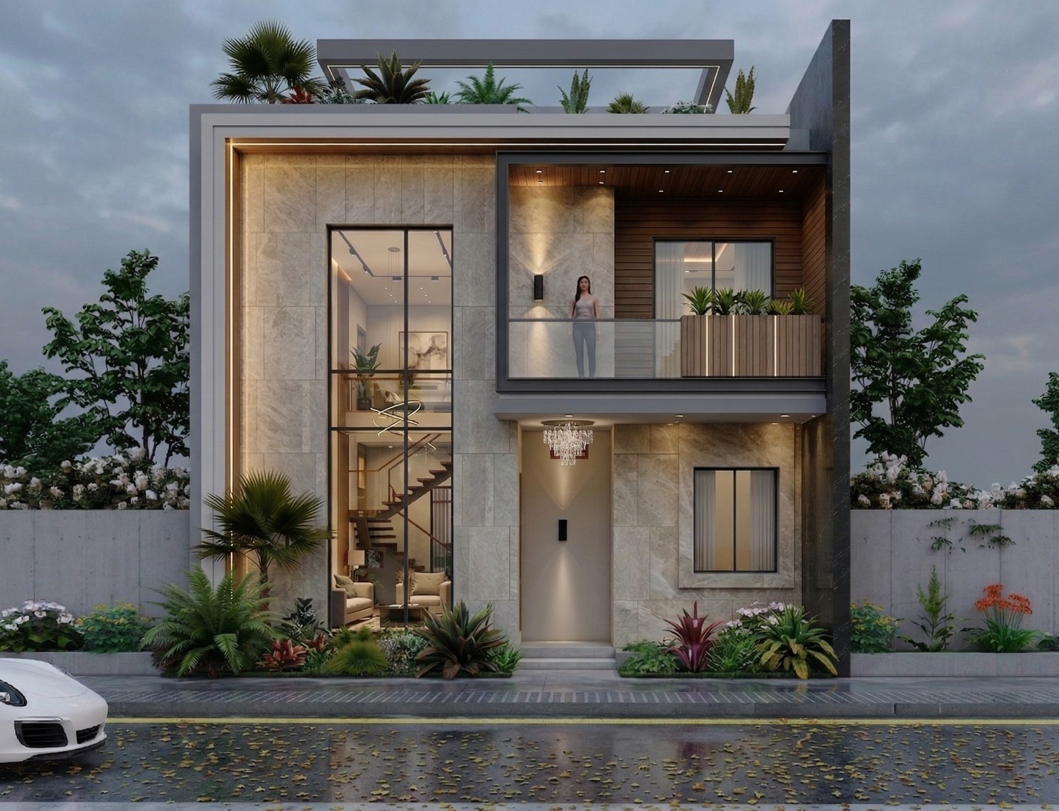 Luminous Stone Retreat is a thoughtfully designed residential concept that reflects modern elegance with a warm and welcoming presence. The structure features a refined blend of natural stone textures and wooden accents, creating a rich and balanced visual appeal. Large glass panels were incorporated to enhance openness and allow natural light to flow seamlessly throughout the space. The double-height entrance adds a sense of grandeur while maintaining simplicity in design. Carefully placed lighting elements highlight architectural details and bring the façade to life during evening hours. Green landscaping and planter zones soften the structure and add a refreshing touch of nature. The combination of clean lines and layered materials creates depth and sophistication. The final outcome delivers a premium living experience with a perfect mix of comfort, style, and modern design identity.