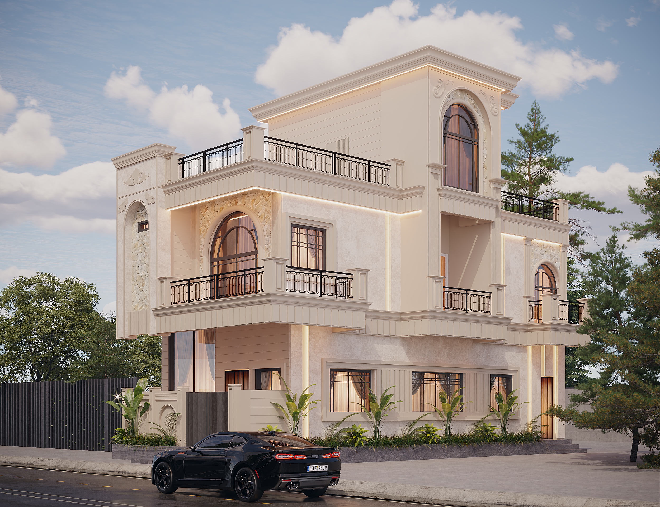 This exterior design project was developed to create a bold and modern visual identity for the residence. The façade features a combination of contemporary materials, clean lines, and layered textures that add depth and character to the structure. A balanced use of stone, wood, and neutral tones enhances the overall aesthetic appeal. Special attention was given to lighting design, highlighting architectural elements and creating a striking look during nighttime. The design incorporates spacious balconies and glass railings to maintain openness and elegance. Vertical panels and geometric patterns were used to create a dynamic and sophisticated elevation. Green elements were integrated to bring a natural touch and improve visual harmony. The final outcome delivers a stylish, modern, and timeless exterior that reflects premium living standards.